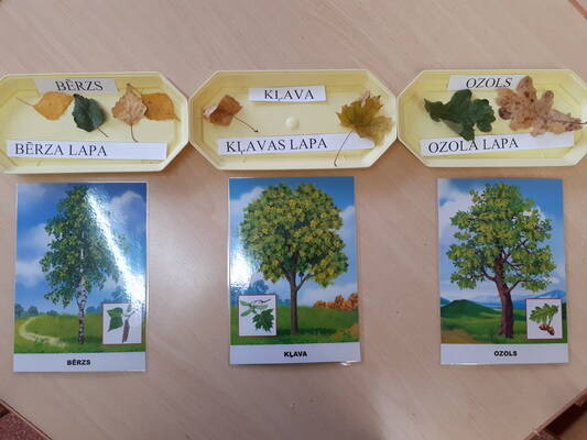 Bērni izliek vārdu "SKOLOTĀJA" no dažādiem materiāliem.